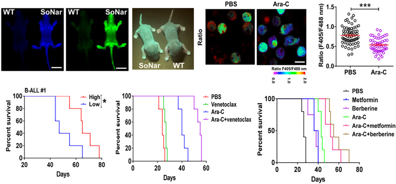 本研究利用遗传编码NADH/NAD+探针SoNar的转基因工具鼠,发现B-ALL 细胞主要以氧化磷酸化作为其主要能源(图2)。SoNar低的 B-ALL 细胞具有增强的线粒体呼吸能力,倾向于驻留在血管壁中,并且比 SoNar高的细胞中的功能性白血病起始细胞富集更多。SoNar低的细胞比SoNar 高的细胞对B-ALL一线用药 Ara-C 具有更高抵抗力。临床样本中,SoNar低的人原代 B-ALL 细胞也偏爱氧化磷酸化,并且对 Ara-C 处理有抵抗力。用 3 种药物(维奈托克、二甲双胍、小檗碱)抑制氧化磷酸化作用,无论在体内还是体外,都能很好减弱 Ara-C 诱导的耐药性(图2)。本研究为理解代谢特性与 B-ALL 细胞的命运决定之间的潜在联系以及开发针对癌症耐药性的治疗策略提供了有效的工具和独特的视角。目前针对B细胞急性淋巴细胞白血病的联合用药方案,亚洲色情