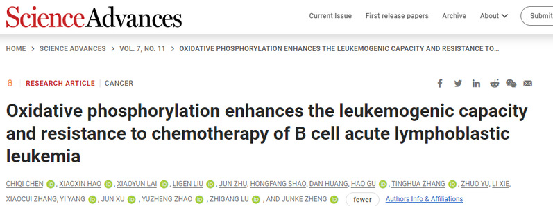 徐俊教授团队合作研究,揭示氧化磷酸化在B细胞急性淋巴细胞白血病的关键作用。该研究成果以“Oxidative phosphorylation enhances the leukemogenic capacity and resistance to chemotherapy of B cell acute lymphoblastic leukemia”为题,在线发表在国际权威学术期刊《科学-进展》(Science Advances 2021,7,eabd6280)上。