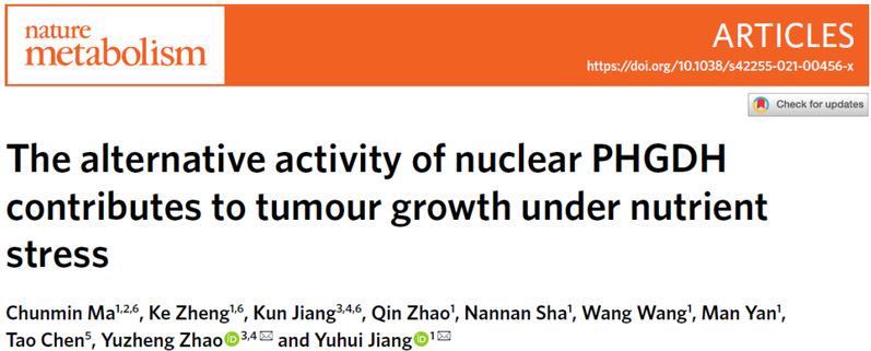 附属仁济医院蒋玉辉研究员团队合作研究,深入解析了营养缺失条件下PHGDH通过核易位以及酶活转变调控细胞核NAD+和肿瘤细胞生长的分子机制。该研究成果以“The alternative activity of nuclear PHGDH contributes to tumor growth under nutrient stress”为题,在线发表在国际权威学术期刊《自然-代谢》(Nature Metabolism, 2021, doi.org/10.1038/s42255-021-00456-x)上。