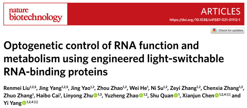 、上海市细胞代谢光遗传学技术前沿科学研究基地杨弋教授团队在RNA光遗传学控制技术研究中取得突破性进展,在国际权威学术期刊《自然—生物技术》(Nature Biotechnology)以长篇论文(article)形式在线发表题为“Optogenetic control of RNA function and metabolism using engineered light-switchable RNA-binding proteins” 的研究文章。