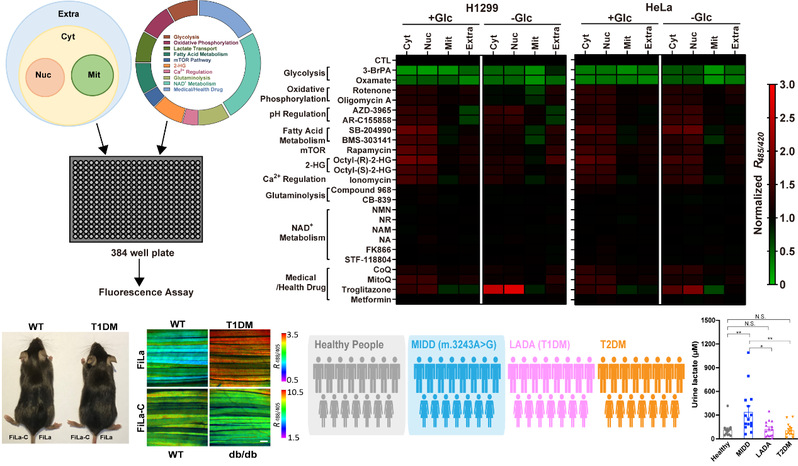 利用FiLa探针,作者首先绘制了亚细胞乳酸代谢图谱。现有的教科书告诉我们乳酸作为糖酵解产物,定位于细胞浆。上世纪90年代末研究者发现线粒体中存在乳酸脱氢酶,由此线粒体内是否存在乳酸这一问题引发了一系列研究和激烈讨论。利用FiLa探针,研究团队率先报道细胞核内乳酸水平与细胞浆水平相近,而线粒体内乳酸水平远高于细胞浆和细胞核。这一发现解决了该领域争议了几十年的重要科学问题,同时首次使人们观察到,人体细胞内乳酸具有更丰富的代谢命运,从而打开了乳酸代谢研究的新窗口。接下来,研究团队基于FiLa探针建立了活细胞水平药物高通量筛选方法,发现乳酸是感知各种代谢活动的关键枢纽。研究团队进一步利用FiLa探针对I型糖尿病和II型糖尿病小鼠开展了活体动物成像研究,并建立了基于FiLa探针的高通量临床样本即时检测技术,分别测定了成人隐匿性自身免疫性糖尿病(I型糖尿病的一类分型)、II型糖尿病、母系遗传性糖尿病伴耳聋MIDD)患者以及健康人的体液乳酸水平,发现MIDD糖尿病人尿液中乳酸水平升高。由于MIDD患者的发病年龄和临床表现缺乏显著的区分度,经常被误诊为I型或II型糖尿病,发现尿液乳酸显著升高可能作为该疾病的潜在筛查标志物,为临床诊断提供了重要依据。