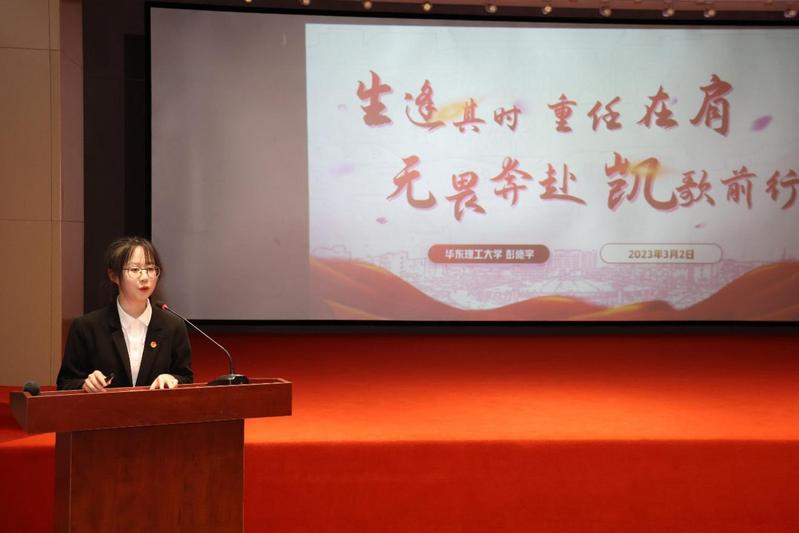 青年代表、上海市“青马工程”高中高校推优一体化培养学生、生物医药工科试验班本科生彭施宇进行了题为《生逢其时 重任在肩 无畏奔赴 言歌前行》的分享,讲述了自己入学以来的志愿服务经历,学思践悟党的二十大精神,握紧时代的接力棒。