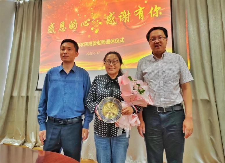 倪炜和赵玉政为两位退休教授献上鲜花并赠送退休纪念品。赵玉政充分肯定了姚蕾老师为亚洲色情