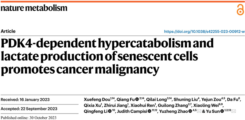 上海营养与健康研究所孙宇研究员合作在国际权威学术期刊Nature Metabolism发表题为“PDK4-dependent hypercatabolism and lactate production of senescent cells promotes cancer malignancy”的研究论文,报道了丙酮酸脱氢酶激酶4(PDK4)是衰老细胞代谢重编程的关键靶标,抑制PDK4可以缓解衰老导致的机体功能障碍,为延缓衰老带来了新的希望。