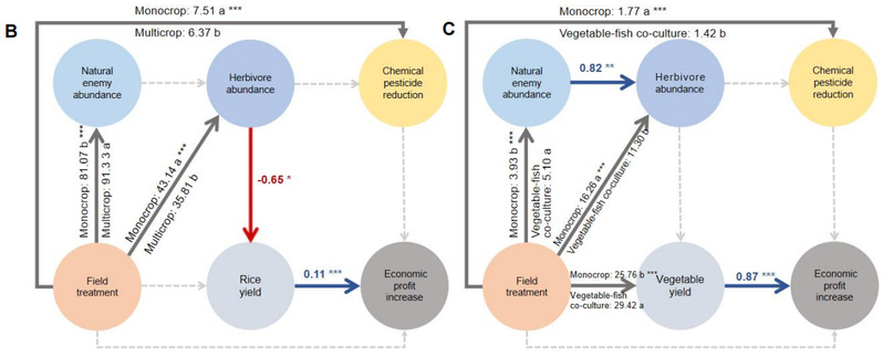 为检验文章中提出的联动链理论的科学性和准确性,作者首先对稻田田埂种植大豆/玉米系统,进行了联动链理论效果检测;经结构方程模型检验,作物多样性增加了稻田天敌、减少了害虫,进而减少了杀虫剂用量、增加了水稻产量且增加了经济效益。紧接着,作者对花菜与水产动物共生系统进行了结构方程模型检验,发现这种多样化模式同样产生联动链趋势(见图6)。