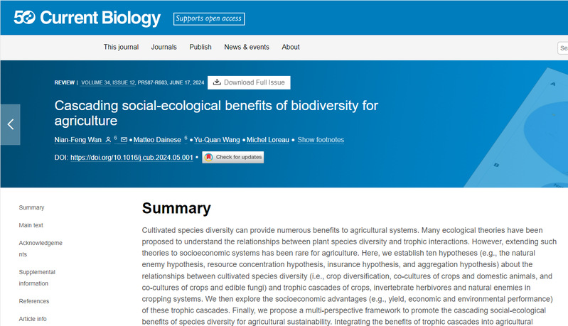 万年峰课题组在Cell子刊—Current Biology上发表了题为Cascading social-ecological benefits of biodiversity for agriculture的原创性成果,该论文被遴选为Featured content。