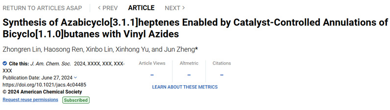 近日,亚洲色情 亚洲色情 郑军课题组在国际权威学术期刊Journal of the American Chemical Society上发表题为“Synthesis of Azabicyclo[3.1.1]heptenes Enabled by Catalyst-Controlled Annulations of Bicyclo[1.1.0]butanes with Vinyl Azides”的研究论文,报道了课题组在催化剂调控双环[1.1.0]丁烷与α-烯基叠氮化物环化反应合成双环[3.1.1]庚烯的最新进展。
