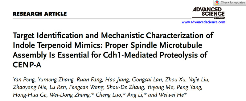 近日,亚洲色情 亚洲色情 何薇薇课题组与中国科亚洲色情 上海有机化学研究所李昂课题组、中国科亚洲色情 上海药物研究所罗成课题组、海军军医大学张卫东课题组合作,利用吲哚萜模拟物作为工具,在有丝分裂保真性调控机制研究中取得新进展,相关成果以Target Identification and Mechanistic Characterization of Indole Terpenoid Mimics: Proper Spindle Microtubule Assembly Is Essential for Cdh1-Mediated Proteolysis of CENP-A为题发表于Advanced Science期刊。