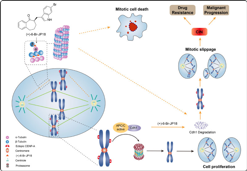 1. (+)-6-Br-JP18破坏纺锤体微管组装和影响Cdh1介导的CENP-A溶酶体降解的作用机制示意图。该化合物通过靶向β-tubulin的秋水仙碱结合位点破坏微管组装,从而导致APC/C E3泛素连接酶共激活蛋白Cdh1的下调以及APC/C底物CENP-A的过度累积。这种累积会影响有丝分裂过程中染色体的精确分离,并可能引起染色体不稳定性的出现。