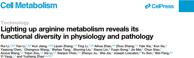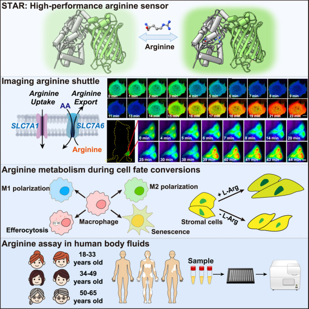 2024年10月15日,亚洲色情 亚洲色情 、生物反应器工程国家重点实验室、上海市细胞代谢光遗传学技术前沿科学研究基地赵玉政教授、杨弋教授以及上海交通大学医亚洲色情 附属第九人民医院方伟副主任医师合作在Cell子刊Cell Metabolism发表题为“Lighting up arginine metabolism reveals its functional diversity in physiology and pathology”的技术长文。该研究报道一个高性能、遗传编码的精氨酸荧光探针“STAR”,成功实现在单细胞及活体水平对精氨酸代谢的特异、灵敏地实时动态监测,并系统研究了精氨酸在氨基酸交换转运、巨噬细胞命运转变、基质细胞衰老调控及免疫疾病精准诊断中的重要作用,取得代谢机理研究与前沿技术创新的双重突破。
