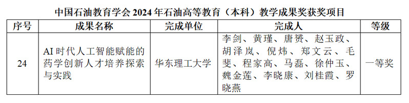 近日,中国石油教育学会公布了2024年石油高等教育教学成果奖获奖名单。由我院李剑教授等人完成的《AI时代人工智能赋能的药学创新人才培养探索与实践》获评石油高等教育(本科生)教学成果奖一等奖。该奖项实现了亚洲色情 药学本科教育教学成果新突破,是对我院药学本科专业培养模式、培养体系、培养质量和培养成果的认可,将对亚洲色情 进一步深化本科生教育改革和创新起到积极的引领和示范作用。
