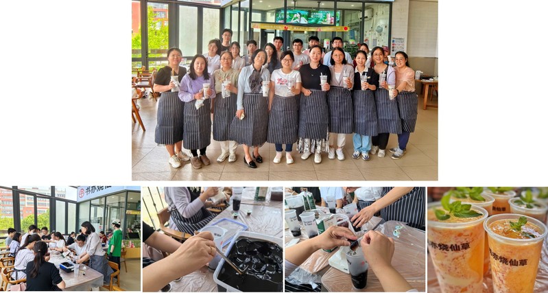 师生们共同制作夏日饮品。大家按照标准化流程,将仙草粉与清水按比例混合,经搅拌、熬煮、凝固,制成烧仙草冻,再准备水果、鲜奶等原料,制作成一杯杯烧仙草奶茶和杨枝甘露。过程中,师生相互协作、交流心得,体验劳动带来的惬意初夏。