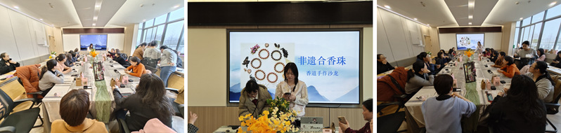 活动现场,檀、沉、乳、麝等天然香药依古法精心配伍,教职工们在指导下亲身参与揉、捻、窖、雕等传统工序。从调和香泥到揉捻成珠,再到静置窖藏、精细雕琢,每一枚合香珠的诞生都凝聚着时光与匠心。通过动手实践,教职工们直观感受传统香文化的制作流程,在实操中领略非遗技艺的特点与魅力。