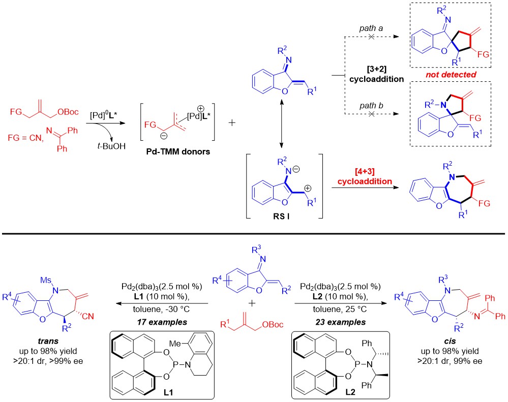 The group of Prof. Deng Wei-Ping reported a palladium-catalyzed asymmetric [4 + 3] cyclization of trimethylenemethane donors with benzofuran-derived azadienes, and the potential [3 + 2] side pathway was completely suppressed in the process. This protocol provides an efficient access to benzofuro[3,2-b]azepine frameworks in high yields (up to 98%) with exclusive regioselectivities and excellent stereoselectivities (up to >20:1 dr,  >99% ee). This reaction represents the first catalytic asymmetric [4 + 3] cyclization of Pd-trimethylenemethane (Pd-TMM), which would enrich arsenal of Pd-TMM chemistry in organic synthesis. In addition, this strategy provides an alternative approach to chiral azepines via transition metal-catalyzed asymmetric [4 + 3] cyclization for the first time.